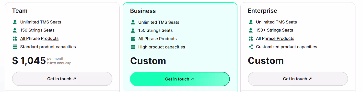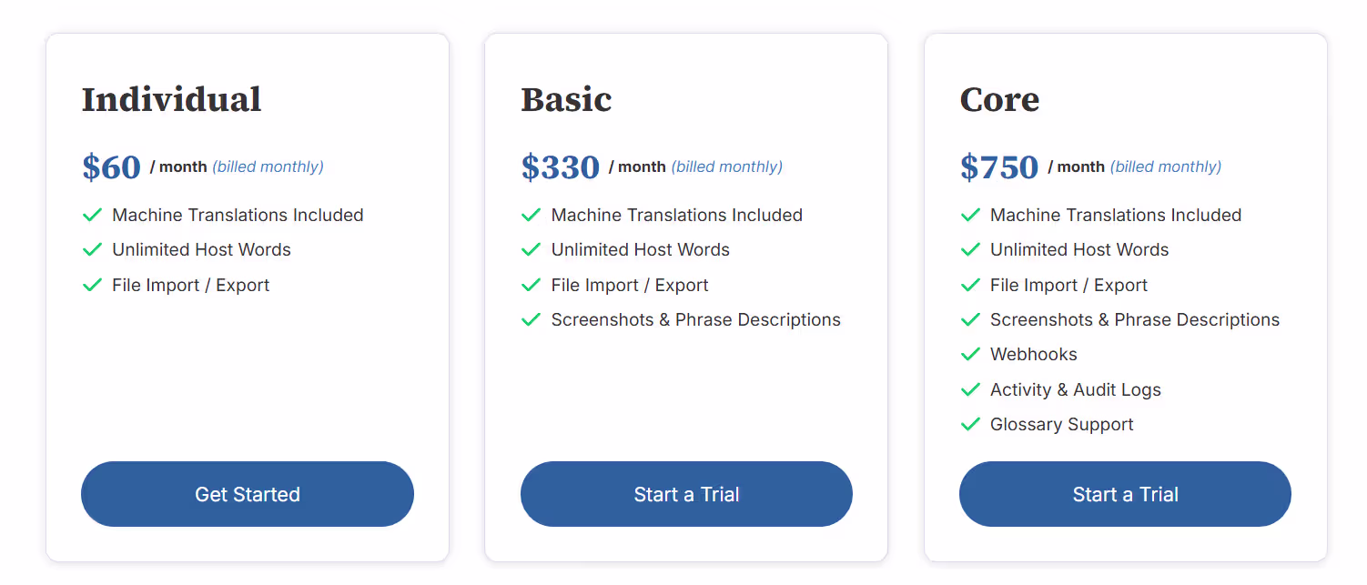 Basic plans range from $50 per month to $625 per month, with Enterprise plans starting at $3,500 per month. G2 reviewers say Localize is a “great value for the money with its tier system.”