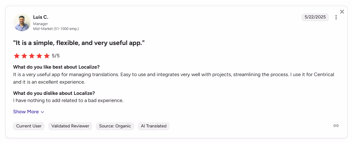 Localize integrates with 40+ systems, including CMS and marketing platforms, without locking key integrations behind higher-cost tiers. It’s used across industries like healthcare, finance, and government, with a focus on quick setup, flexible workflows, and best-in-class support for both small teams and enterprises.